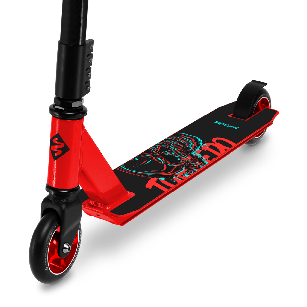 The Torpedo is a reliable and affordable freestyle scooter, built to perform great stunts at the skate park. The 6061 aluminum deck offers maximum strength with the lightest weight. The wheels are high grip polyurethane on an anodized core to provide the very best in style and performance.